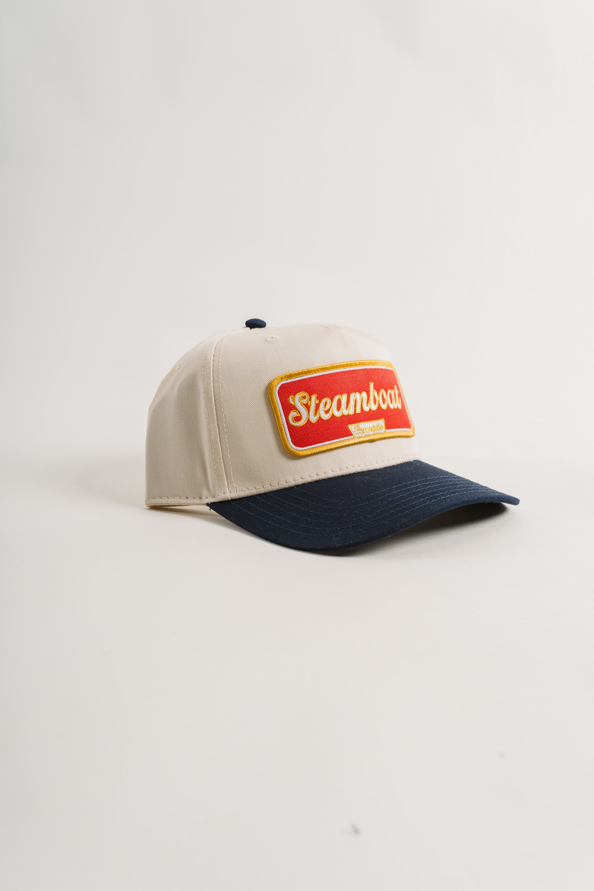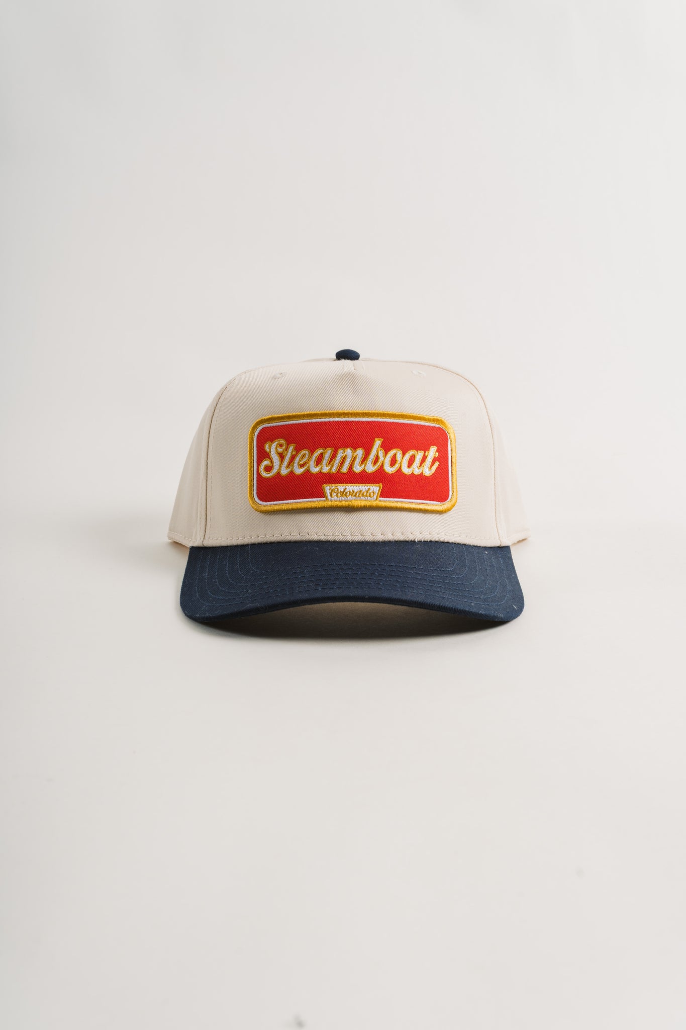 A nod to the old-school mountain west. This two-toned Otto trucker hat features a rich navy crown and natural back, made from soft, breathable cotton fabric for all-day comfort. Front and center is our Steamboat Banquet patch—a vintage-inspired design that captures the spirit of après gatherings and high-country good times. Finished with a classic snapback closure for an easy, adjustable fit.