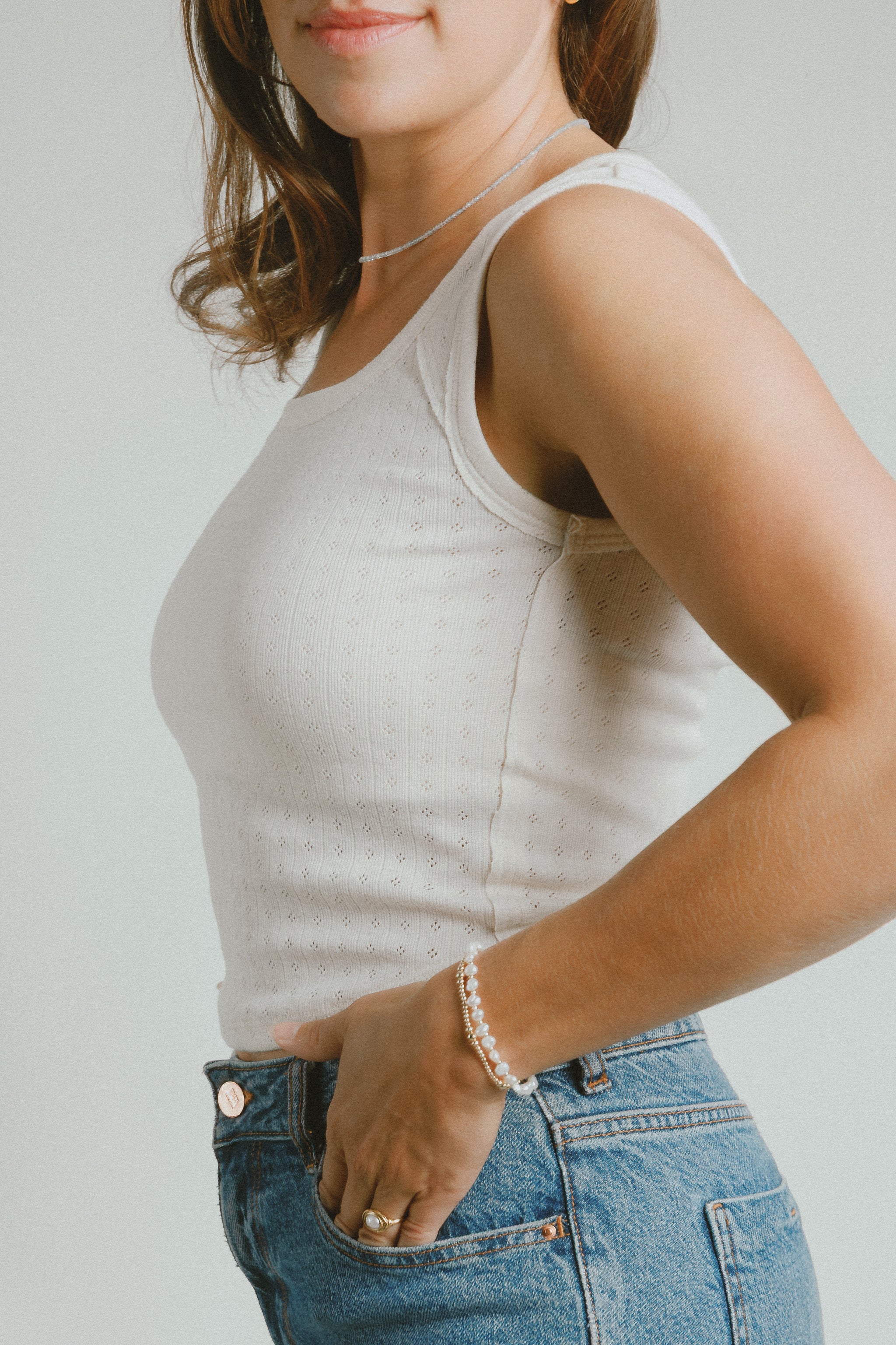 A refined essential with quiet detail. This handmade tank is crafted from a soft, breathable cotton-blend knit featuring delicate diagonal stitch lines that create a subtle texture and natural stretch. The scoop neckline and clean-finished cap sleeves flatter without fuss — a perfect blend of structure and ease.