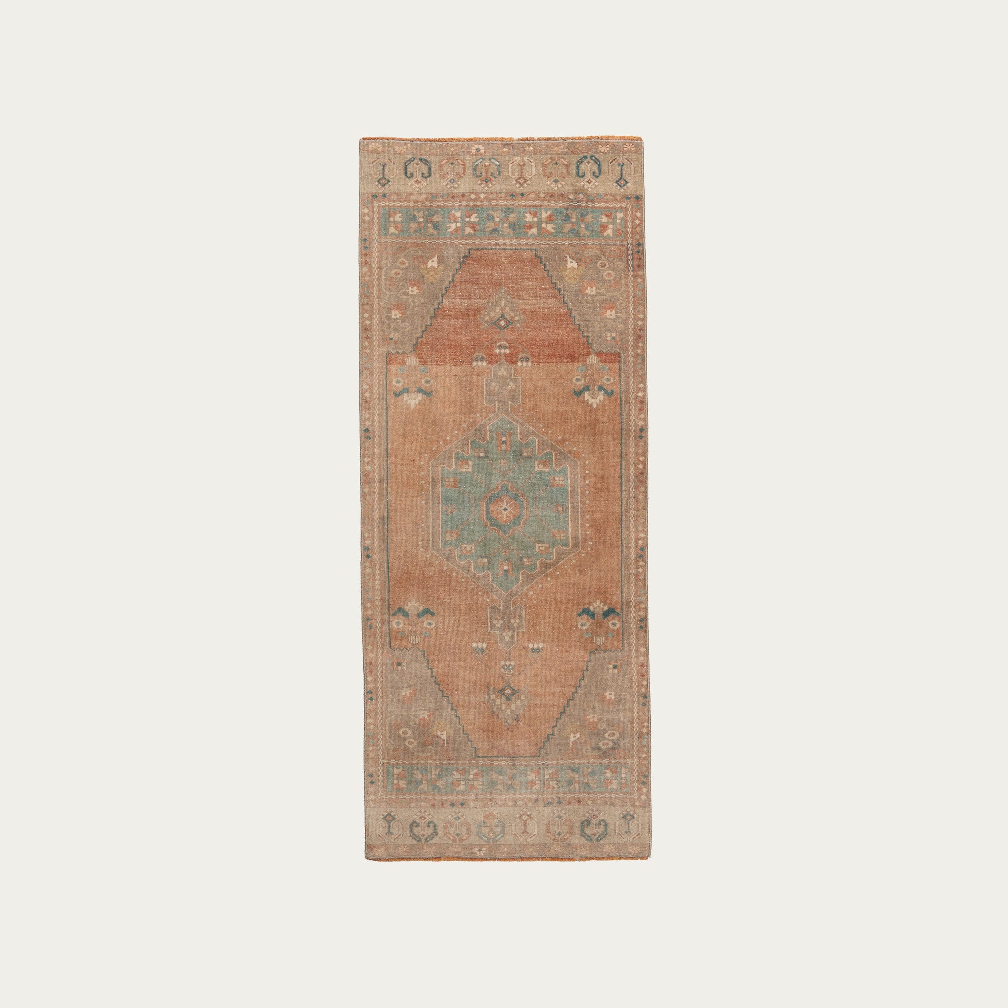 This vintage Turkish runner captures the essence of Anatolian artistry with its soft balance of taupe, weathered teal, and muted rust tones. A striking diamond medallion anchors the design, framed by intricate borders and gentle abrash that reveal the passage of time through its naturally faded hues.