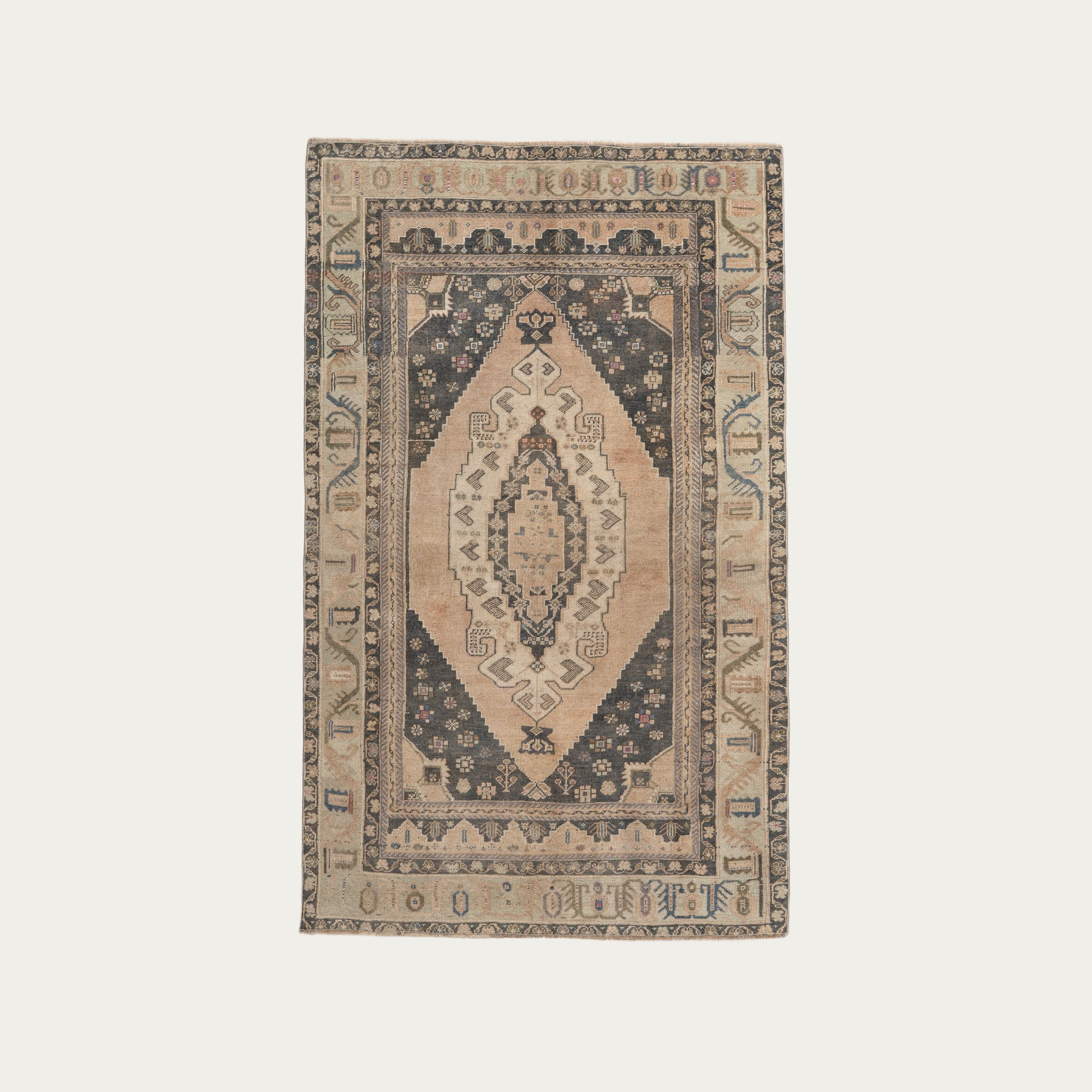 A stunning piece of Anatolian heritage, this vintage Turkish rug features a beautifully worn tribal medallion design in an earthy, moody palette of faded black, dusty beige, ivory, and hints of muted rose and blue. The hand-knotted wool construction speaks to the artistry of mid-20th century Turkish weavers, blending traditional symbolism with a time-softened aesthetic perfect for modern interiors.
