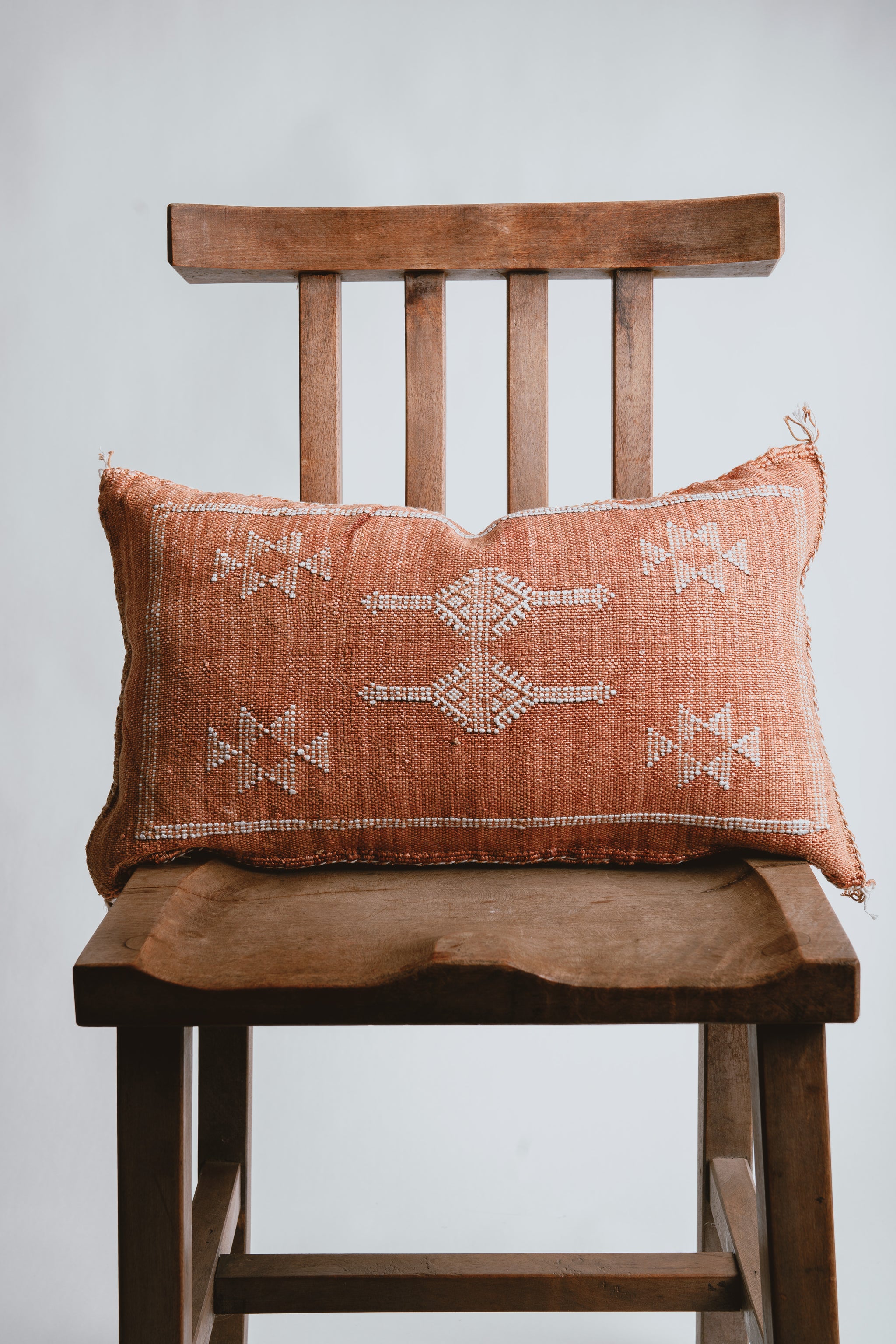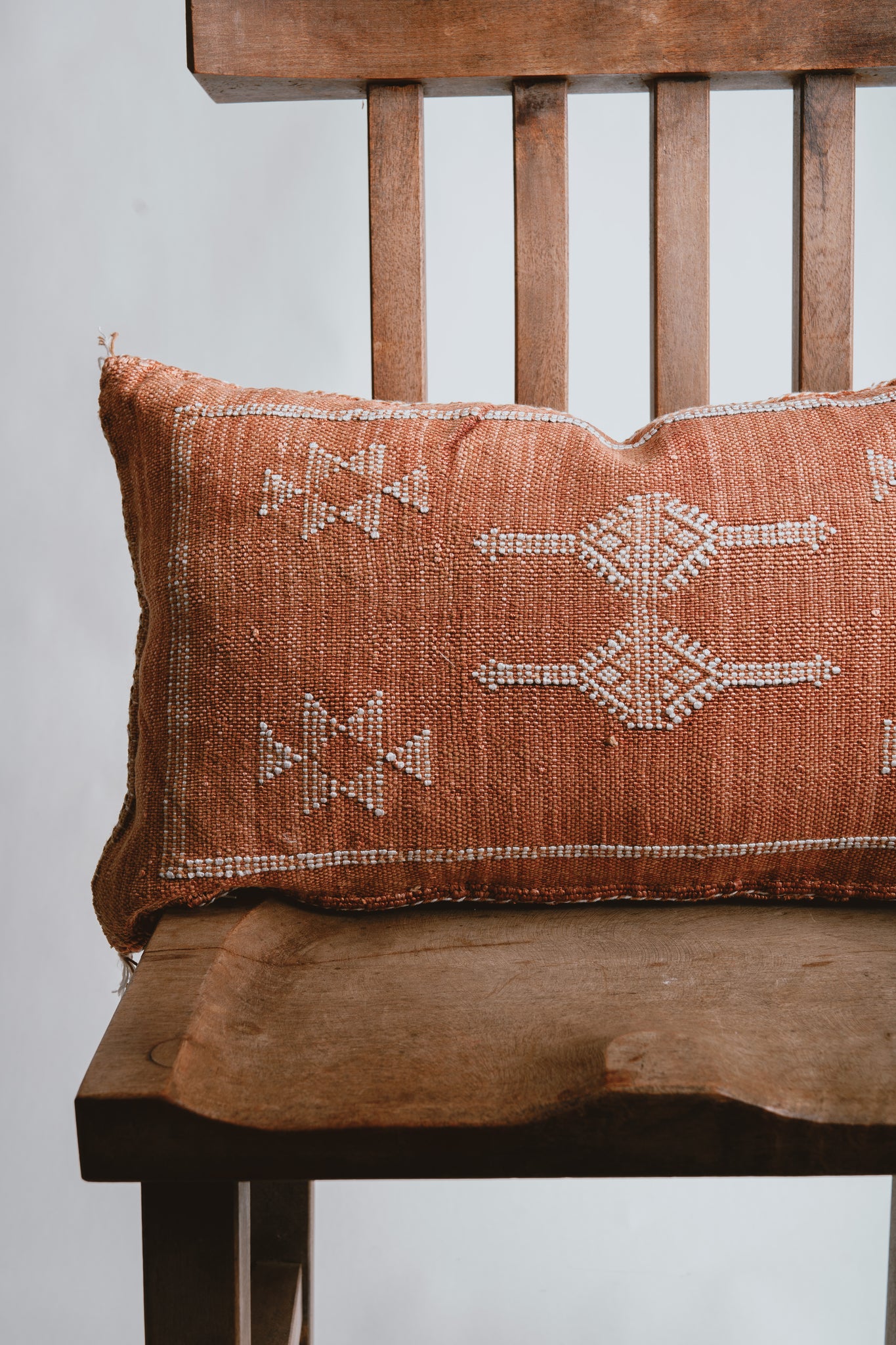 Warm and grounded, our Sienna cactus silk pillow brings an earthy, sun-baked hue to any space. Each cover is hand-loomed in Morocco from sabra (cactus) silk, then sun-washed and finished with traditional Amazigh stitchwork—so no two are exactly alike. The soft matte sheen and subtle abrash make it an effortless layer for sofas, beds, and reading nooks.